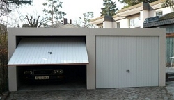 mit Quersatteldach und Sektionaltor.Die Satteldach-Betongaragen, die als Einzel, Doppel oder Reihen-Betongaragen auf die Grenze gebaut werden können, weil der First parallel zur Einfahrt liegt. Neben Häusern mit Satteldach sind zunehmend auch die Betongaragen mit Satteldach gewünscht. Für die meist notwendige Grenzbebauung wurden deshalb diese Modelle geschaffen, und lenken durch das querliegende Dach die Strassengeräusche ab, schützen das dahinter liegende Grundstück. Lieferbare Sektionaltore, z.B. 3,38 m x 2,44 m im Lichten, mit je 2Lichtöffnungen aus Acryl-Doppelscheiben. Die Tore sind nylongelagert, mit geräuschdämmender Hohlraumversiegelung, doppelter seitlicher Verriegelung, Puffern und Sicherheitszylinder. |