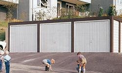 massiver Reihengaragen vor.Die 3S-Reihengaragen bestehen aus hochwertigen, gütegeprüften Fertigteilen. (3S-Stahlbeton-B55). Die Konstruktion ist typengeprüft. Dennoch kosten sie weit weniger als in herkömmlicher Weise gebaute Garagen. 3S-Stahlbeton, kombiniert mit einem wartungsfreien Iso-Trapez-Dach ist ohne Instandhaltungskosten und von hoher Lebensdauer. Das Dach aus Profilplatten spezieller Abmessungen entwässert nach hinten, wahlweise nach vorn. Dafür geben wir 25 Jahre Garantie. |