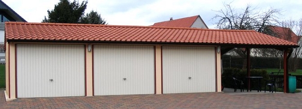 zirkulierende Belüftung vom Boden zum Dach.Das Dach aus Profilplatten spezieller Abmessungen entwässert nach hinten, wahlweise nach vorn. Für die Dachseitenverkleidung vollenden Spezialwinkel das Aussehen; sie werden immer mitgeliefert. Regenabflussrinne und Fallrohr (mit Haltern) passen nur an die Traufseite der Garage bzw. bei Doppelgaragen hintereinander vorn und hinten. Im Garagenpreis ist das breite Tor - verzinkt und grundlackiert, mit doppelter und seitlicher Verriegelung, Sicherheitszylinder usw. - enthalten; als Sonderausstattung Tore mit Fichte- Dekor oder Kassettentore. Zwei Tore zum Durchfahren bei Größe 4, 6 und 8, Traufe beidseitig. Passende Carport-Anbauten neben, vor und hinter der Garage, z. B. zum Überdachen des Stauraums vor der Garage. |
