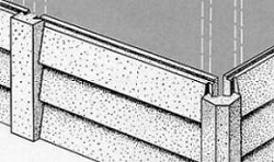 | Jedes Betonteil ist entweder mit einer geschweißten Stahlbewehrungsmatte oder einem Baustahlkorb - entsprechend seiner Formgebung und Beanspruchung armiert. Die Wände sind nach dem Baukasten-System aus Betonwandfeldern und Betonpfosten aufgebaut. Mit einem schwalbenschwanzförmigen Rand fügen sich die Wandteile seitlich in die entsprechend geformten Pfosten ein. Übereinander greift der obere und untere Rand jeder Wandplatte so in die nächste, dass ein wetterdichter Abschluß entsteht. Verzinkte Schrauben und Klemmplatten sichern den festen Sitz. | |||||||||||||||||||||||